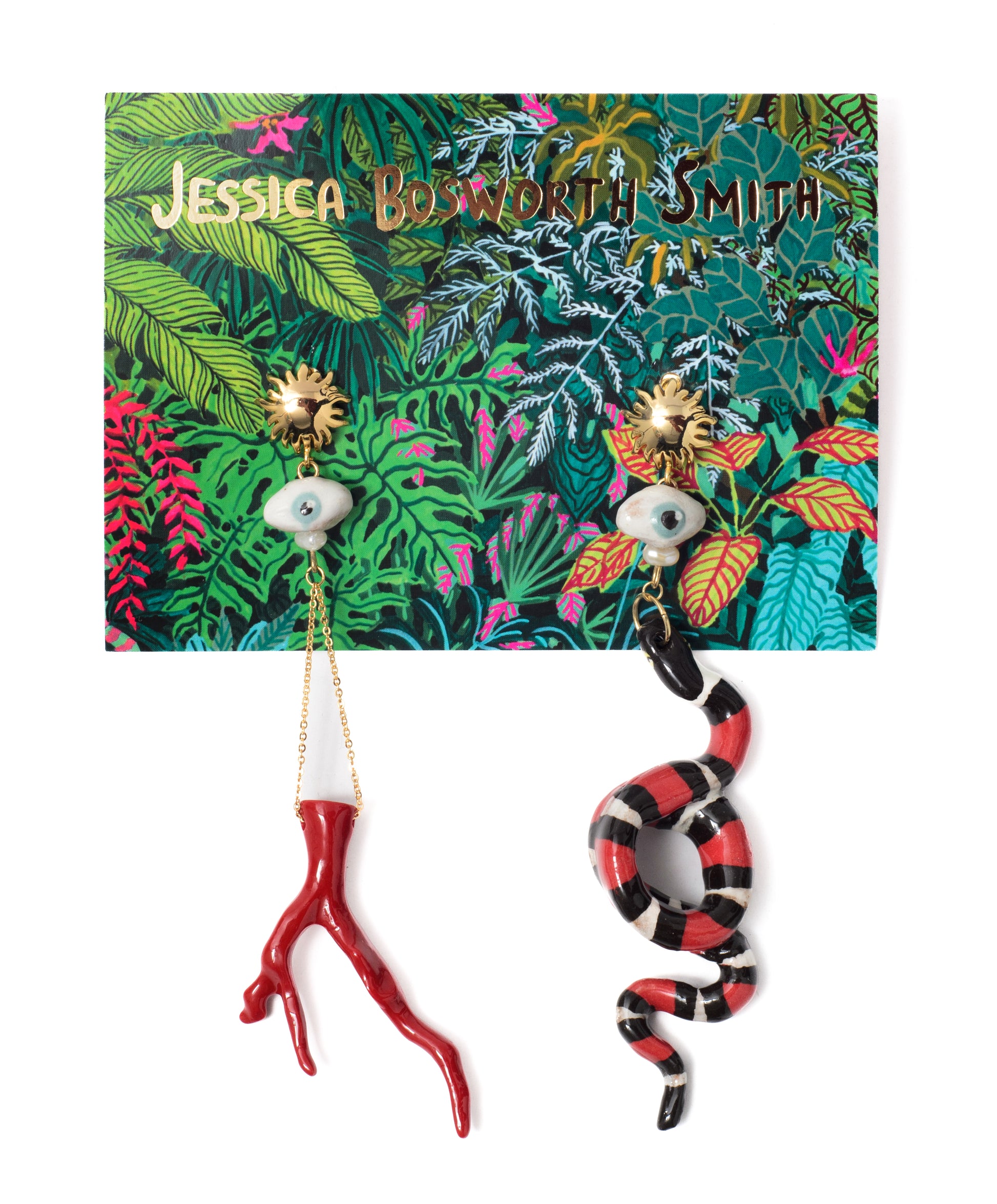 18k gold-plated earrings with hand-made ceramic eyes and snake charms, keshi pearls, and imitation coral. These earrings are part of an open edition.
